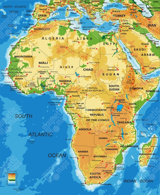 Magnetická mapa Afriky, geografická, barevná