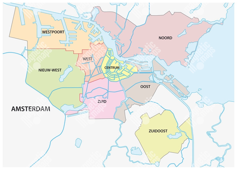 Magnetická mapa Amsterdamu, administrativní, barevná