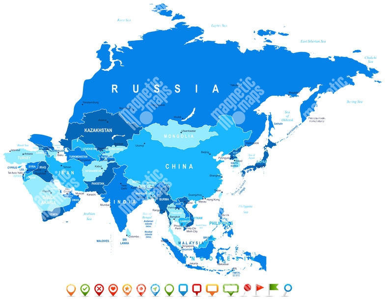 Magnetická mapa Asie, ilustrovaná, modrá