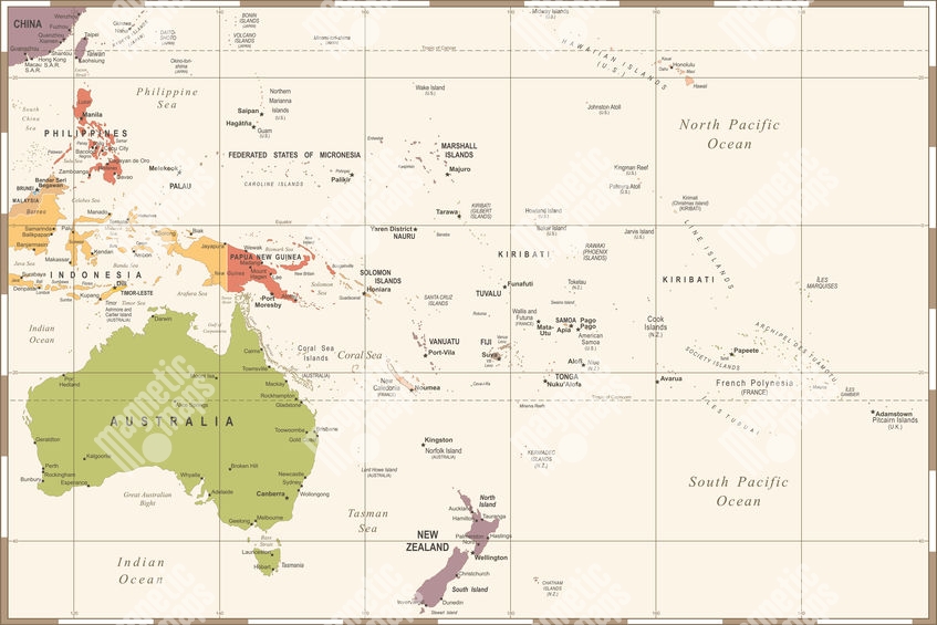 Magnetická mapa Austrálie a oceánie, ilustrovaná, barevná