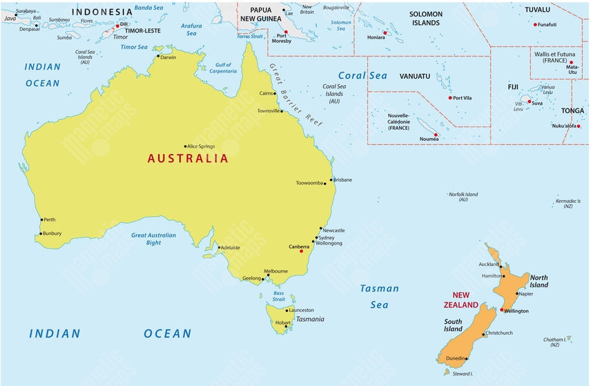 Magnetická mapa Austrálie a oceánie, politická, barevná