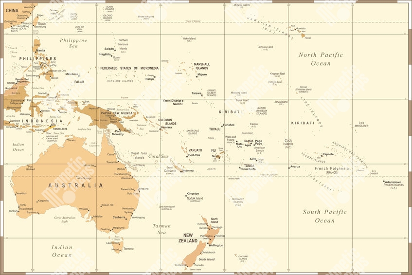 Magnetická mapa Austrálie a oceánie, vintage, béžová