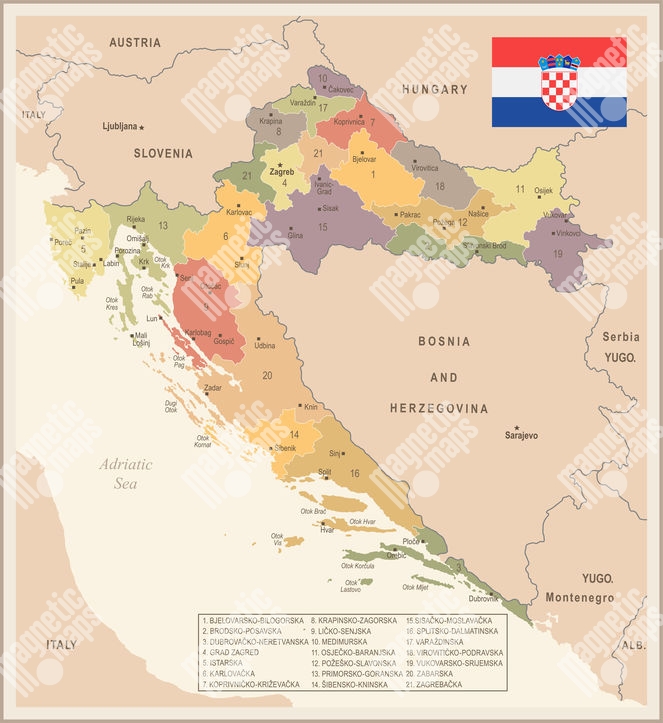 Magnetická mapa Chorvatska, vintage, barevná
