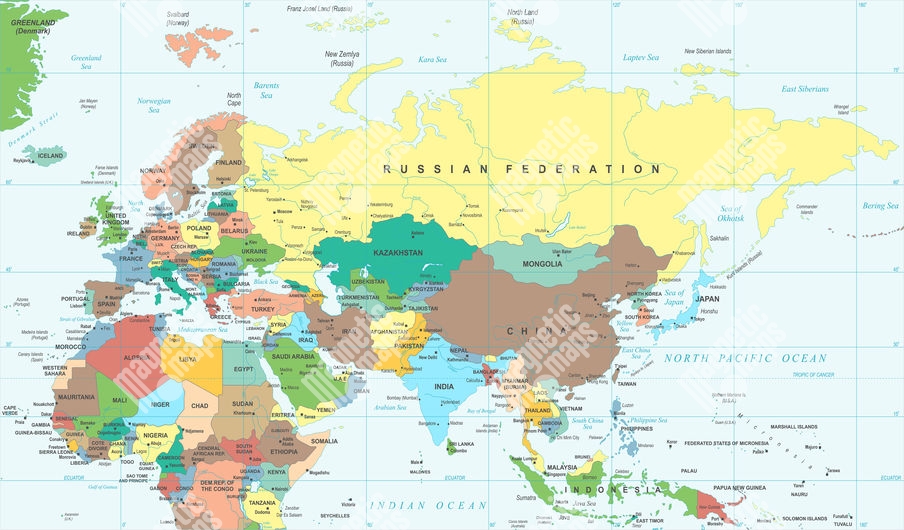 Magnetická mapa Eurasie - Evropa a Asie, detailní, barevná