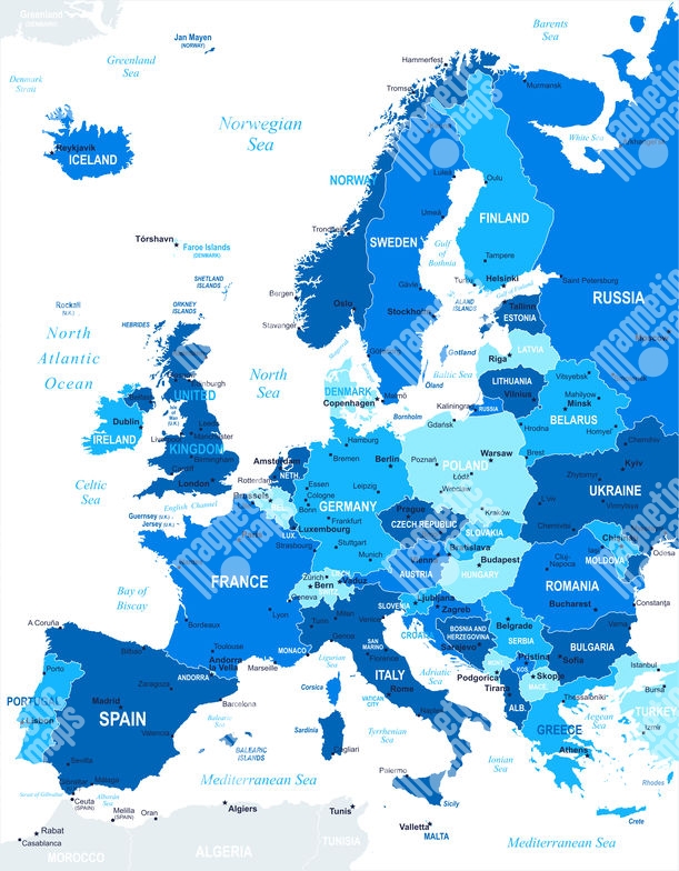 Magnetická mapa Evropy, ilustrovaná, modrá
