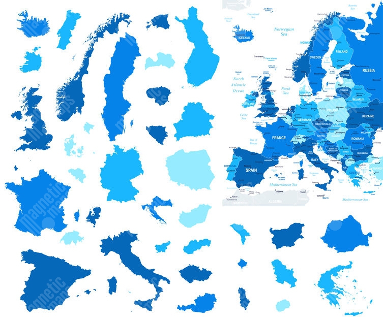 Magnetická mapa Evropy, ilustrovaná, modrá