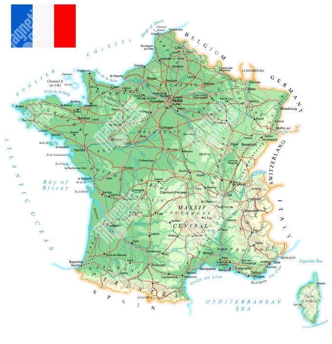 Magnetická mapa Francie, geografická, barevná