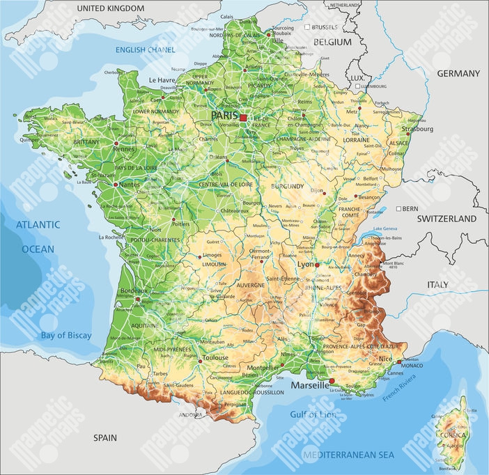 Magnetická mapa Francie, geografická, barevná
