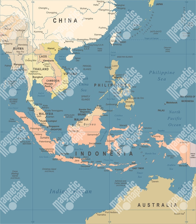 Magnetická mapa Jihovýchodní Asie, ilustrovaná, vintage