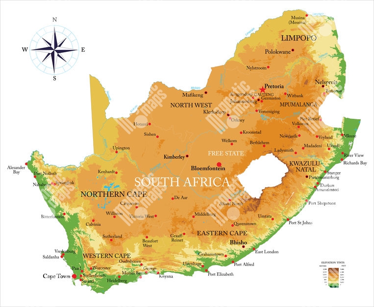 Magnetická mapa Jižní Afriky, geografická, reliéfní