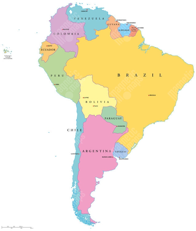 Magnetická mapa Jižní Ameriky, ilustrovaná, barevná
