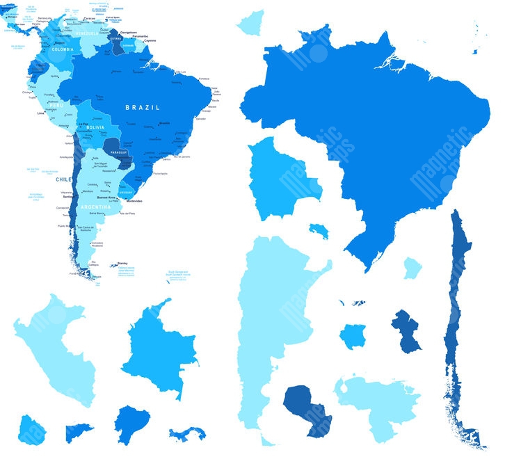 Magnetická mapa Jižní Ameriky, ilustrovaná, modrá
