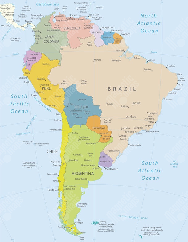 Magnetická mapa Jižní Ameriky, politická, barevná
