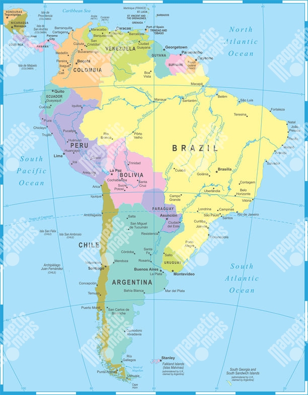 Magnetická mapa Jižní Ameriky, politická, barevná