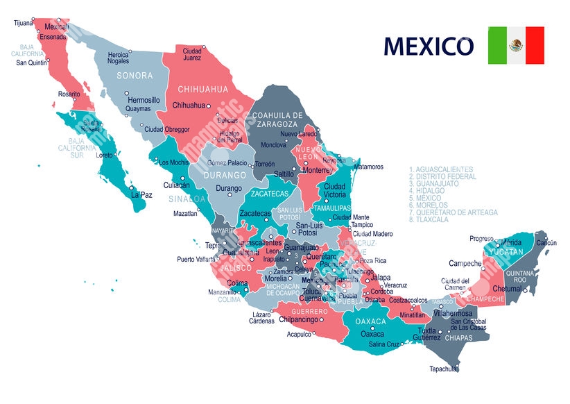 Magnetická mapa Mexika, ilustrovaná, barevná
