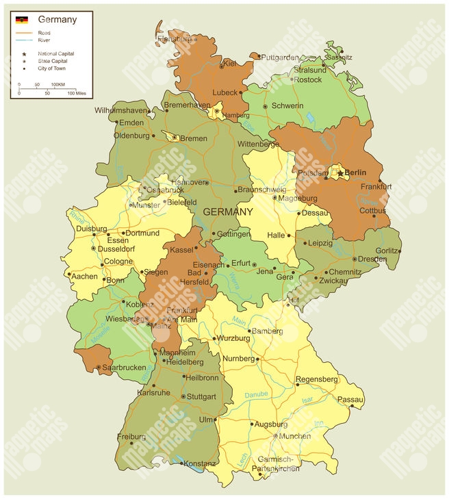 Magnetická mapa Německa, politická, barevná