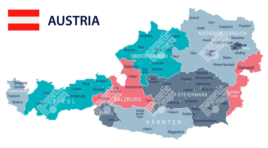 Magnetická mapa Rakouska, ilustrovaná, barevná