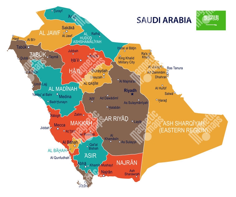 Magnetická mapa Saudské Arábie, ilustrovaná, barevná