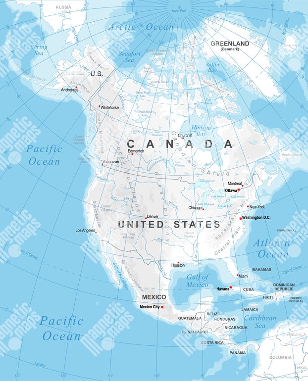 Magnetická mapa Severní Ameriky, geografická, detailní