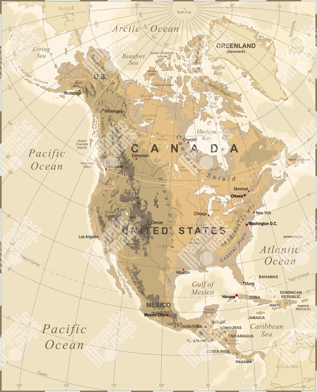 Magnetická mapa Severní Ameriky, geografická, vintage