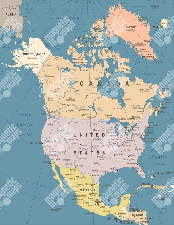Magnetická mapa Severní Ameriky, ilustrovaná, barevná