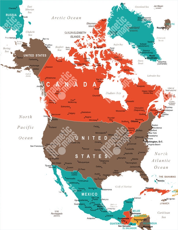 Magnetická mapa Severní Ameriky, ilustrovaná, barevná