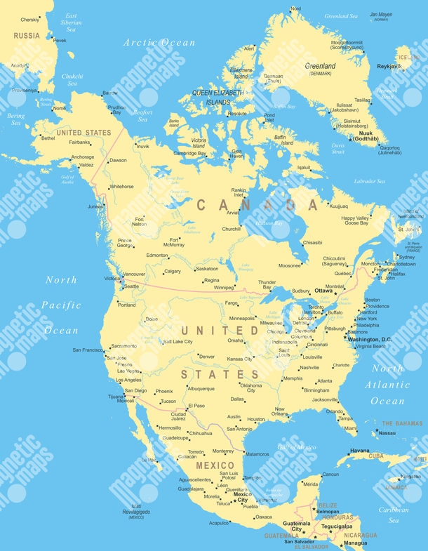 Magnetická mapa Severní Ameriky, ilustrovaná, detailní