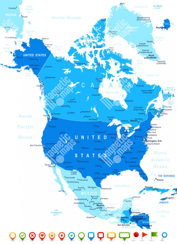 Magnetická mapa Severní Ameriky, ilustrovaná, modrá
