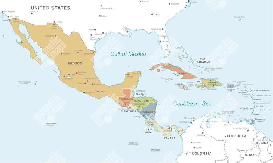 Magnetická mapa Střední Ameriky, vektorová, barevná