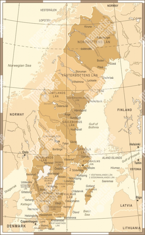 Magnetická mapa Švédska, vintage, hnědá