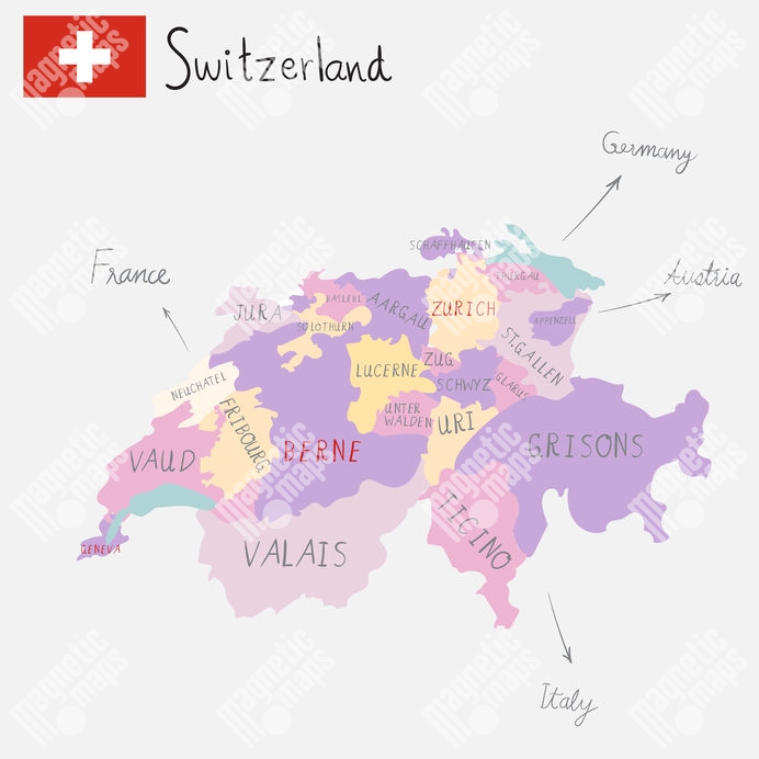 Magnetická mapa Švýcarska, ilustrovaná, barevná