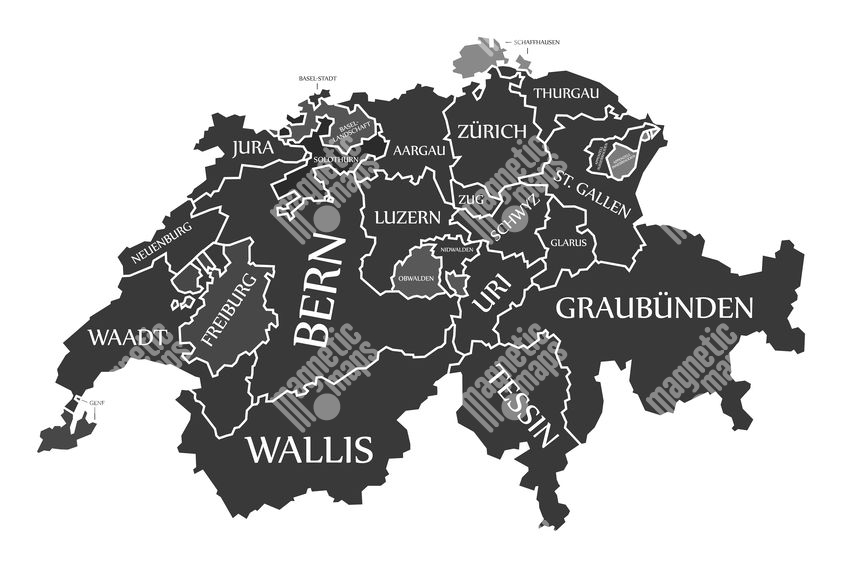 Magnetická mapa Švýcarska, ilustrovaná, černá