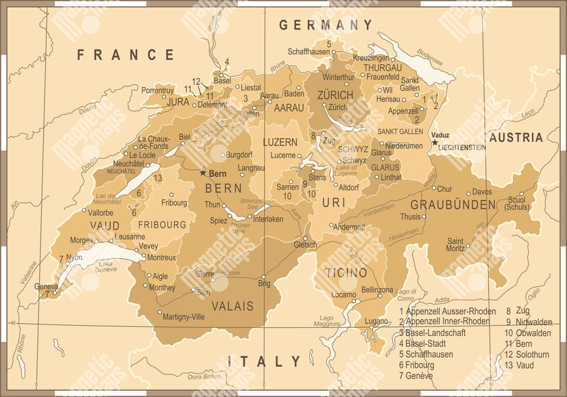 Magnetická mapa Švýcarska, ilustrovaná, hnědá