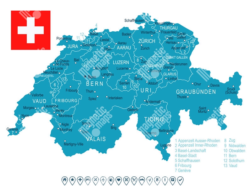 Magnetická mapa Švýcarska, ilustrovaná, modrá