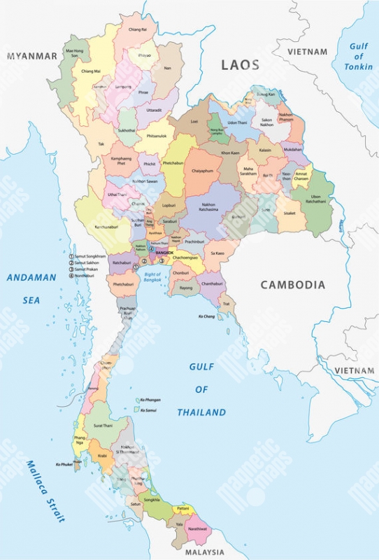 Magnetická mapa Thajska, administrativní, barevná