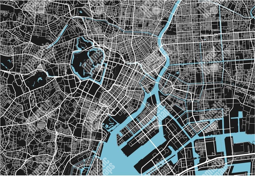 Magnetická mapa Tokia, ilustrovaná, černo-bíla