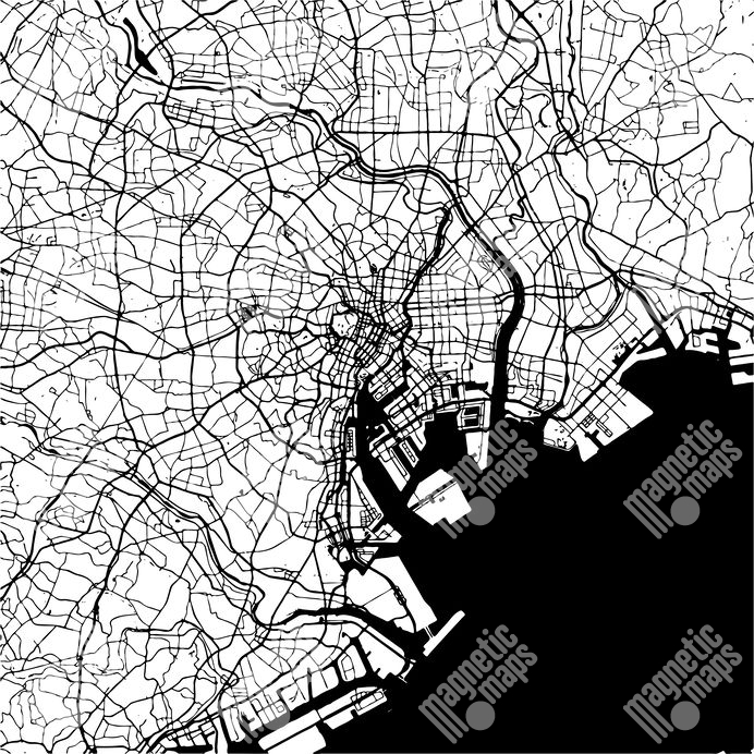 Magnetická mapa Tokia, ilustrovaná, černo-bíla