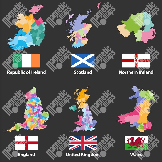 Magnetická mapa Velké Británie, administrativní, barevná