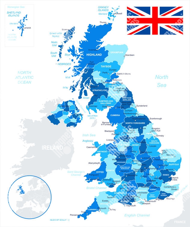 Magnetická mapa Velké Británie, administrativní, modrá