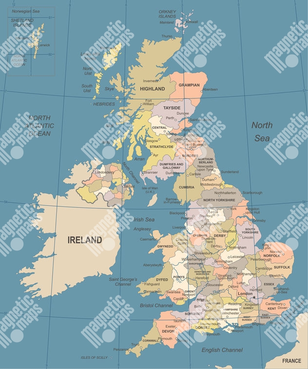 Magnetická mapa Velké Británie, ilustrovaná, barevná